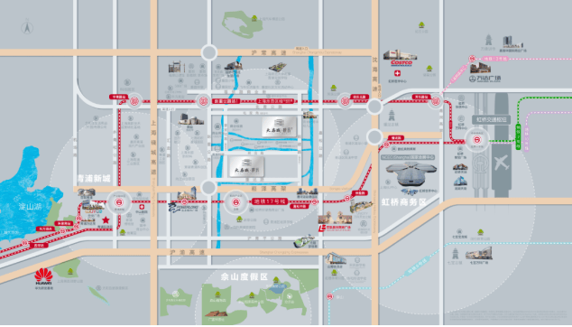 五横:沪常高速、北青公路(计划拓宽)、示范区线(沪苏嘉城际线)、崧泽高架、17号线。