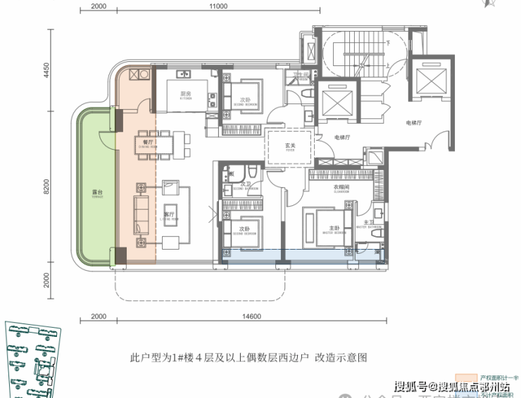 (148㎡方厅户型包含露台得房率为101%左右,客厅宽约7米,主卧宽3.8米,南向次卧3.5米,偶数层为主卧露台和北向露台,奇数层为客厅和次卧露台)
