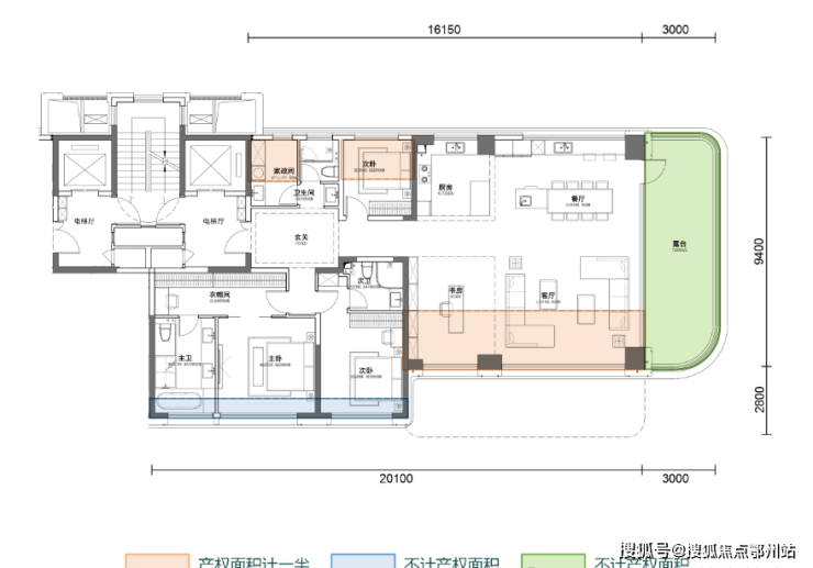 (198㎡端厅户型包含露台得房率为109%以上,客餐厅尺寸约9.4*6.15米,主卧宽约4.15米,南向次卧宽约3.6米,偶数层为客厅南侧露台,净深约2.4米,奇数层为客厅边侧露台)