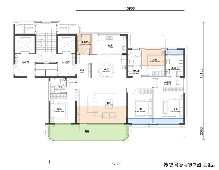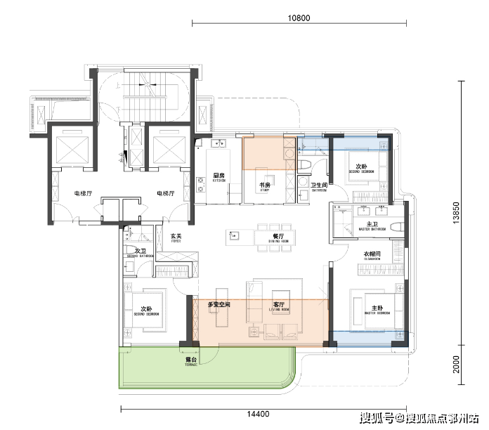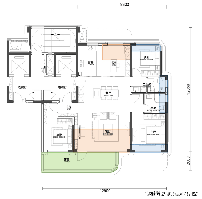 不足:南向露台错层无间隔,隐私性差;卫生间布局集中,使用动线干扰,主卧没有干湿分离;次卧面积较小;作为改善户型,玄关较小,没有实用的家政间;卧室无法实现南北通风。