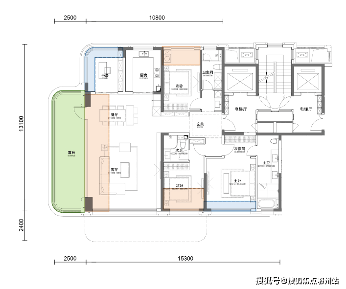优点:五个功能间朝南,20米长南向采光,客厅、主卧、次卧、书房、主卫生间均朝南,满足北方人对阳光的需求。改造后可以得到80㎡以上的公共区域,作为家庭影院、健身区等,适应多样化生活需求;270°环幕视野结合宽幕露台,视野和观景效果极佳。