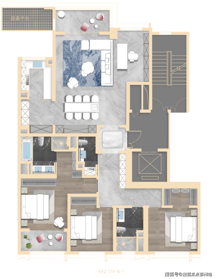 尤其 主卧星级套房 ,配置独立衣帽间、书房,奢华主卫四分离,双台盆+淋浴区+大浴缸+智能马桶,私密性&奢适度无敌;