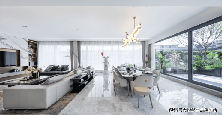 项目平均南向面宽约 23 m,最大面宽达到了较为惊人的26m,很大程度保证了室内采光和视野;第二,南向玻璃最大约65%窗墙比,而目前市场上大部分豪宅窗墙比在50%左右,让室内场景的透光面积更大;
