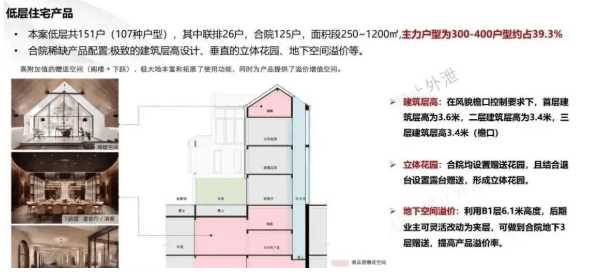壹号院风貌面积大一点很多都是3.9米的层高,3.9/3.6/3.6,这个配置目前属顶配,地下室也是挑高6.1米,整体空间感尺度不错的!