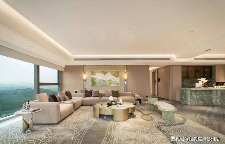 主卧的锤纹门把手、地板花瓣拼、镂花的空调出风口每一个都是世界级的工艺。 同样,精装的用材也很考究,从电梯厅到室内各种奢材在这里齐聚, 瑞士翡翠、白雪公主、蒂芙尼绿、巴黎金等奢石,还有仿锤纹夹丝玻璃、仿古锈镜、隐木这些罕见用材增添艺术质感。