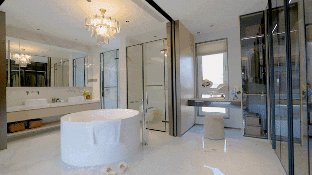 三层可以说是更为震撼的,这一层是专属于主人的天地。 整体宽敞明亮,步入式衣帽间、中央圆形浴缸布置如酒店般舒适精致,独立起居室给生活倍添仪式感。