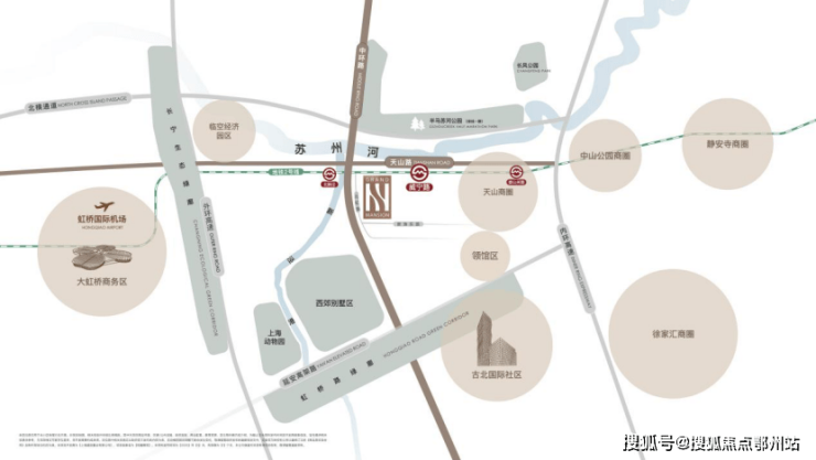 和樾长宁所在的天山板块,直距地铁2号线威宁路仅800米,北新泾仅300米,西接中环、东邻虹桥商务区,更与苏州河生态廊道仅一步之遥——这里不仅是交通枢纽,更是长宁“西进战略”下产城融合的黄金锚点。