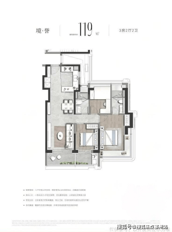 首先是南向配置双阳台,可根据需要打通或进行功能划分。