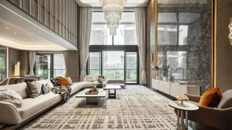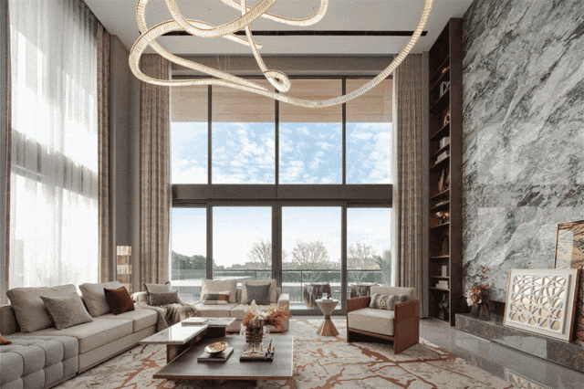 而在空间上,国色风华更是跳出了市场简单堆砌尺度的模式,从主人个性主权自由度出发,重新构思空间与生活的平衡。全城罕见的约6.6米挑高客厅,搭配270°U型阳台,重构大平层空间秩序。