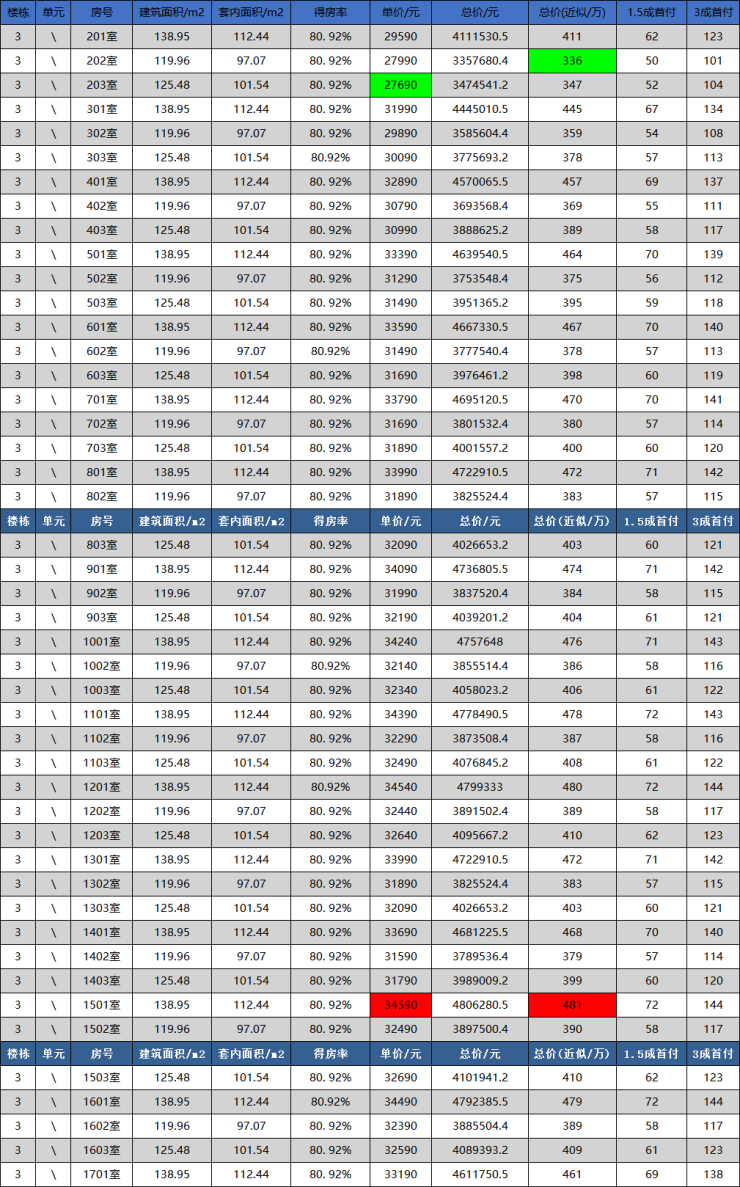 (备案单价和总价中标记 绿色 的表示最低价,标记 红色 的表示最高价)