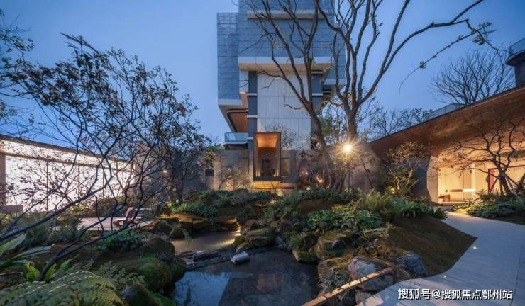 迎宾之景,恰如一幅浑然天成的艺术品,现代设计语言融入自然肌理。石壁间,悬瀑,银河般倾泻而下,水落溅起的细碎水花,在光影中流转。