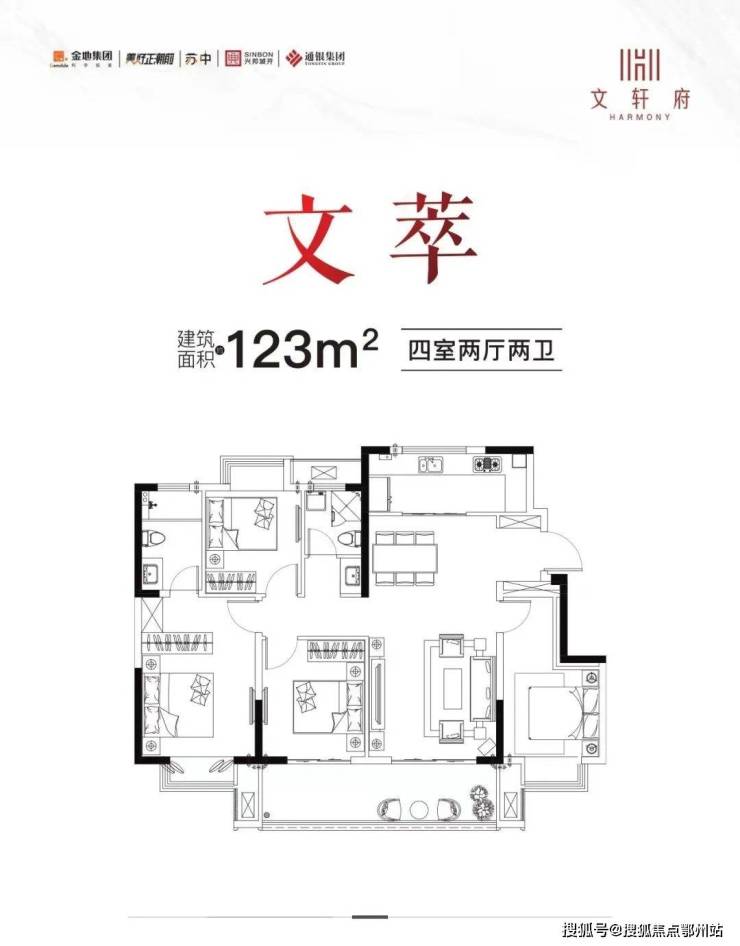 最后看建面约123㎡的户型, 无疑是高端改善买房人的优选户型 。在方正、明亮、通透的基础上,做到客厅、主卧、儿童房、老人房。 四开间朝南的空间布局 ,让每一处空间都得以充分发挥。杜绝空间零浪费,延伸出品质生活的舒适尺度。