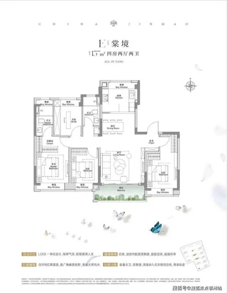 建面约117㎡3房2厅2卫 ,做到了 3+1开间朝南+5个飘窗+主卧套房设计+270°转角飘窗, 所有的尺度都有进一步提升。