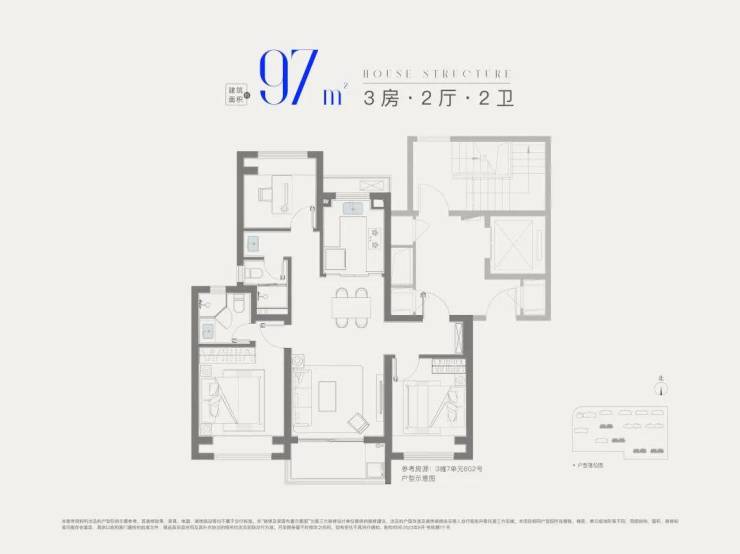 建面约97㎡3房2卫, 升级版大3房,入户玄关+主卧套房设计 ,整体私密性更强,空间更为宽敞。