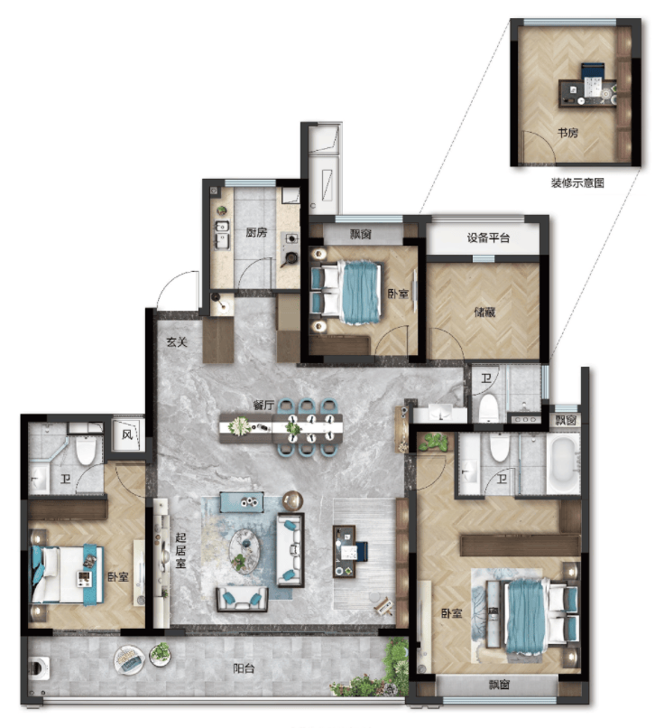 户型来看,目前1#、2#在售,其余楼栋已经售罄。其中187m2大平层户型,三卫、双阳台设计,约6.95m开间,LDK一体化设计,把居家活动空间放大,同时整体也预留了可改造空间,完全满足三代同堂和二孩家庭所需。主卧配备约4.55m全景飘窗,独立卫浴、衣帽间,舒适性还是很不错的。