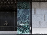 金色飘檐擦亮辨识度,南立面以大面玻璃主打,白、金、蓝灰为主调,配合部分涂料;基部用上了贝金米黄大理石,温润如月光。