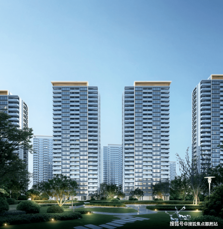 8栋高层建筑呈 大围合布局,每一栋都在 四面大面积铝板建筑立面、外墙 三玻两腔LOW-E玻璃的基础上,注入崭新设计灵感, 顶部暖色“皇冠”格栅,打上了湖畔高颜值标签。