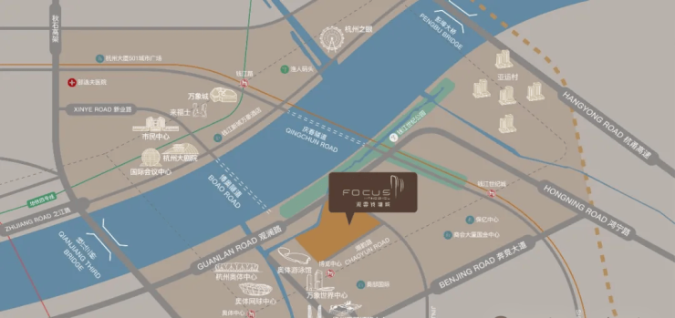 该项目地理位置优越,临近规划中的地铁6号线及2号线,另有三条通道可快速直达对岸的钱江新城。