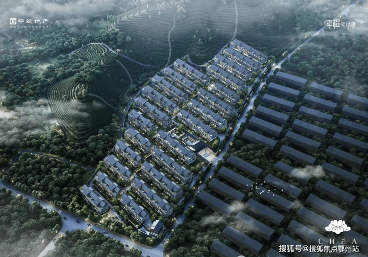 山水韵:建筑群如远山淡影,采用大面积玻璃幕墙与橡木灰金属材质,消隐建筑边界,让居所融于茶山云雾之间。