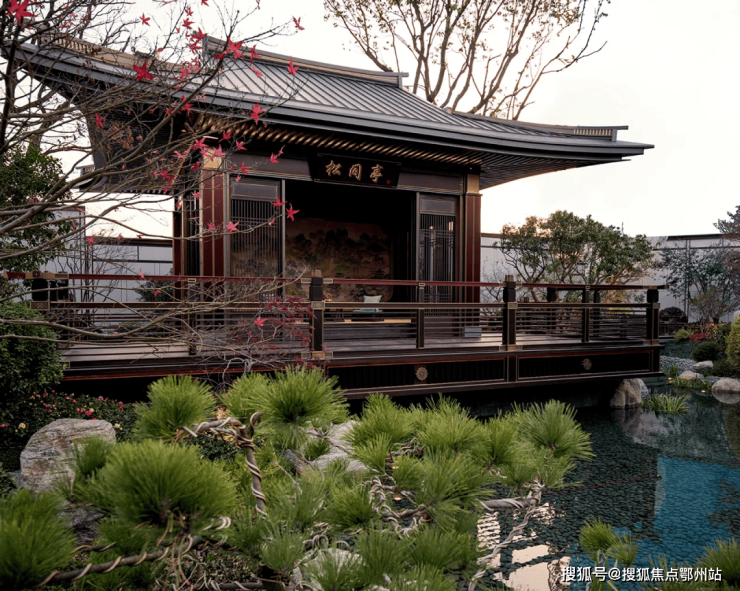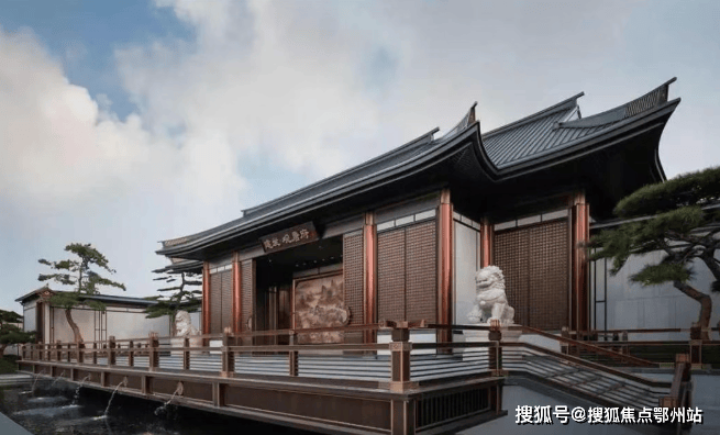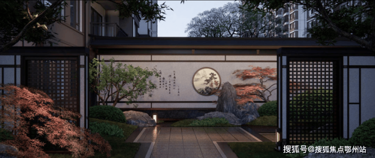 项目采用三段式入户:一进辋川入画(主入口空间),二进:闲庭碎影(戏台庭院),三进:临风听湖(自然庭院)。入户大门屋顶采用唐代“重檐歇山顶”形式配上台基上的唐代建筑标志阑干,入院后有一副唐风画作,其次以亭台楼榭、理水叠山的中国园林意境,重现盛唐大明宫百花争艳,小桥流水,落叶如金的景观。社区景观层层递进,让住户置身其中,体验唐风山水。