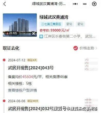 24年7月12日,绿城武汉黄浦湾最后一栋住宅5号楼取证,毛坯备案均价约45604元/平,相比前期的3号楼,备案价下降5062元/平。