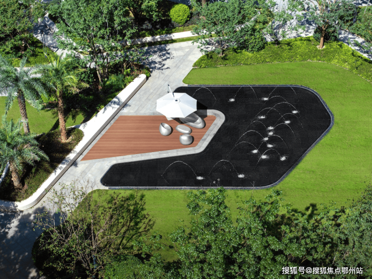还不止,项目三期还多处设置了镜面水景、喷泉等景观组团,园林的丰富度更上一层楼。