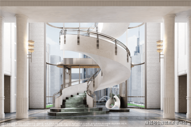 再仔细看细节,顶部香槟金色格栅塔冠以及壁柱采用香槟金和白色色调,将海派与现代之美生动演绎。
