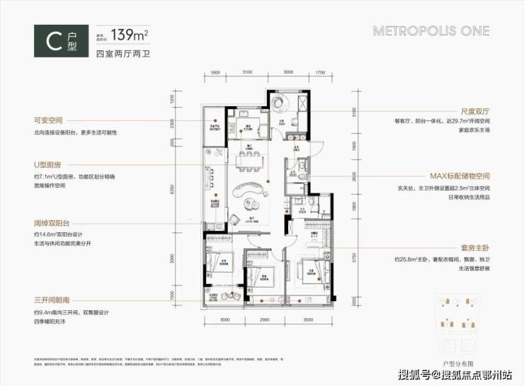 约139平方米的户型则展示了对生活品质的追求,宽敞的大厅设计让居室显得开阔,双阳台和双飘窗的设计巧妙地分隔了生活与休闲区。这样的环境使得每天的居住都成为享受。4室2厅2卫餐客厅阳台一体化,近约29.7㎡开阔空间,9.4m南向三开间,双飘窗设计约25.8㎡套房式主卧奢华衣帽间