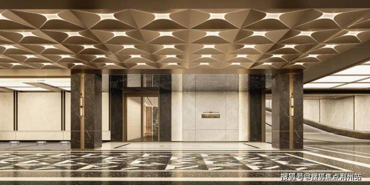 柱体黑骑士岩板包覆,辅以酒店式壁灯造型,地面环氧磨石地坪拼花,与吊顶和谐呼应。归家大堂,层次感光影艺术,迎接优雅归履。