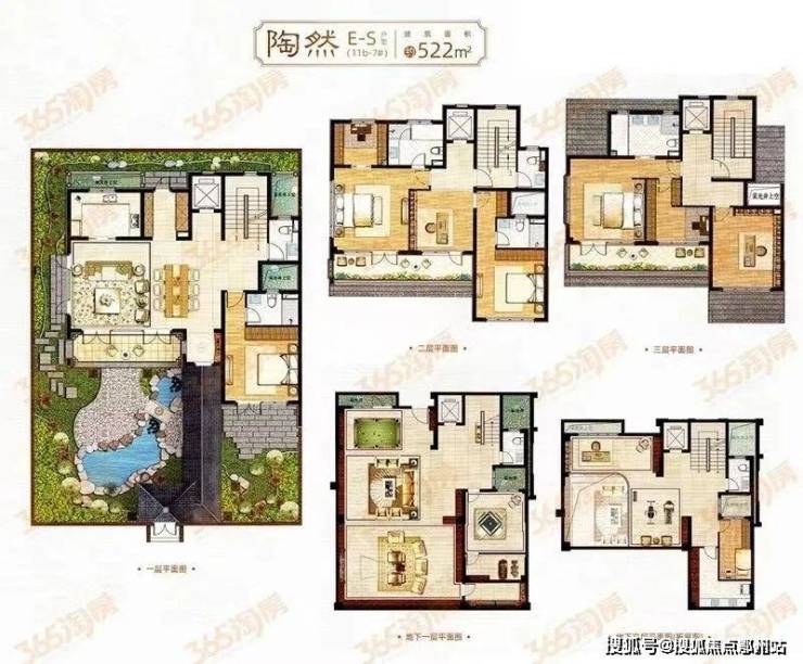 项目共有5种户型,建面约240、约300、约373、475、522㎡,