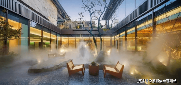 而门口的墙面,更是用大理石与绿植山石装裱出一幅立体的山水画,在垂直立面上演绎“石中有画,画中有境”的宋式空间美学。为了契合宋代织锦的“天华纹”, 泳池对景墙独创了“琉璃錾铜·经纬叠映”的构造 ,以铜为骨,内嵌玻璃砖墙,用琉璃构建出特殊的“经纬提花”