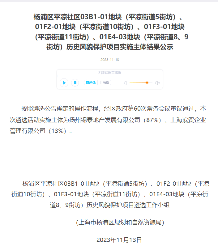 2023年12月,中信泰富(87%)联合杨浦国资(13%)通过协议出让,以总价1143905万元,楼面价63127元/m²竞得4宗打包地块:杨浦区平凉社区03B1-01地块(平凉街道5街坊)、01F2-01地块(平凉街道10街坊)、01F3-01地块(平凉街道11街坊)及01E4-03地块(平凉街道8、9街坊),总建筑面积18.1万㎡。(其中住宅建筑面积11.3万㎡,办公建筑面积5.2万㎡,商业建筑面积1.6万㎡)