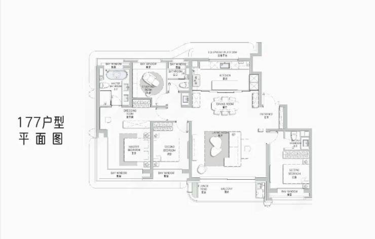 建面约177㎡户型是本批次的重点户型,总价约2300-2500万级,改善一步到位,后续再无!阔朗的四开间朝南设计+双套房设计,保证不同家庭成员起居的私密性。
