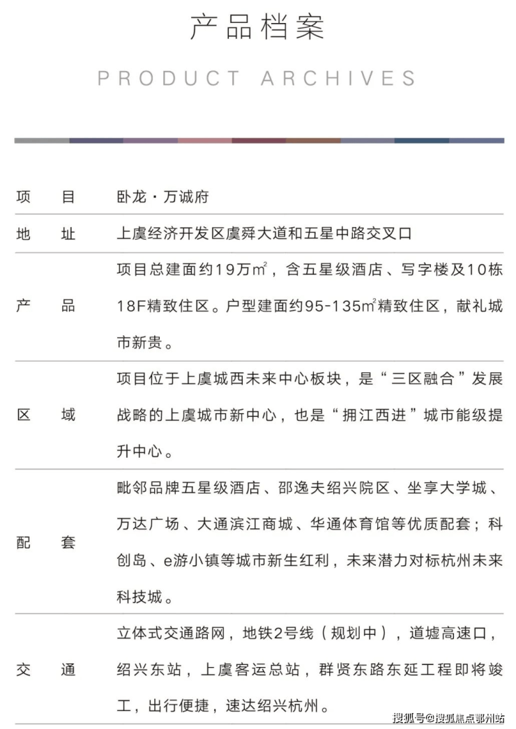 卧龙·万诚府位于上虞区经济开发区四环路与五星路交叉口,总建筑面积约19万㎡,住宅规划10幢高层,总户数约670户。