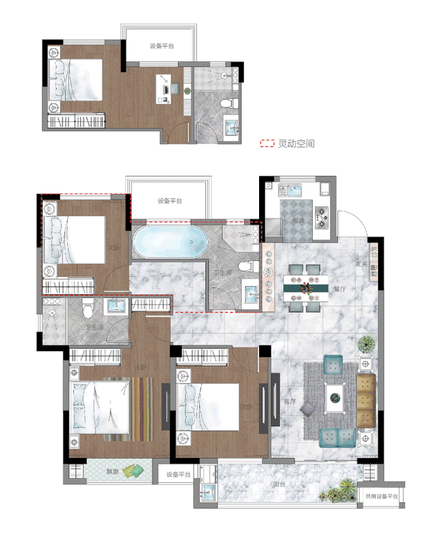 ● 灵活空间的充分合理利用,浴室一部分可改造成书房等,户型空间升级,“放大”居家尺度,完全随心打造。