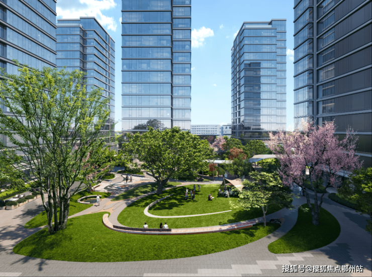 整个园区以围合式布局展开,七幢建筑借鉴中国古典园林的精髓,最大楼间距达到了63米,使得每栋楼都能享受到270°的开阔视野,仿佛是一座座隐匿于花园中的岛屿。为了与景观相呼应,园区立面采用“水晶天幕”设计,线条纤细,使建筑宛如天空中垂下的纯净湖面。