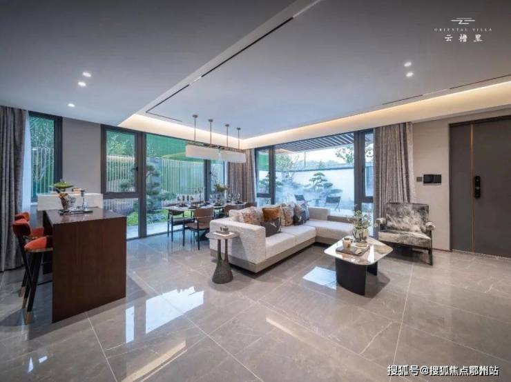 云檐里叠墅外立面用了豪宅专属的石材和铝板,且干挂石材价格昂贵,高档大气,足以拉满豪宅属性;木纹铝板,以及三玻两腔low-e中空玻璃,高级感扑面而来。暖灰色和香槟金的配色,让这份美学感更具时间穿透力。