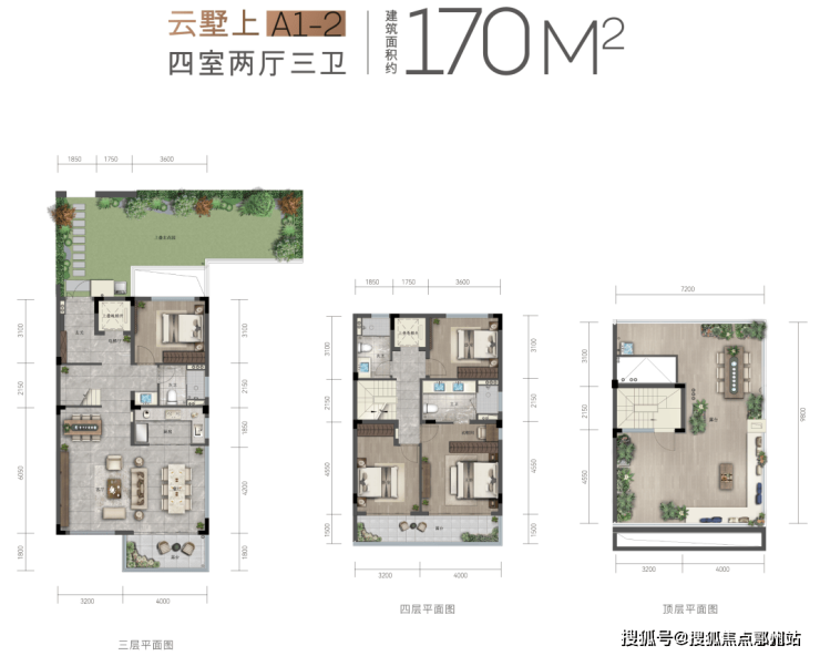云檐里给出了下叠建面约165方、上叠约170方和上下叠约179方这4款主力户型。