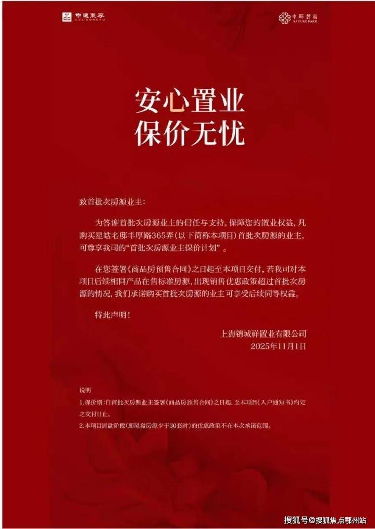 上海第二个作出 “保价”承诺的项目,11月1日,中环麓岛项目也发布了公告:凡购买首批次房源的业主,可享“首批次房源业主保价计划”: