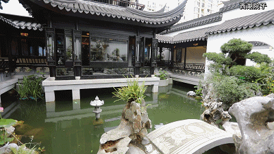 粉墙黛瓦,飞檐花窗,花街铺地,假山叠石……一走进西湖院子,浓浓的中式大宅韵味便扑面而来。优雅别致的观景亭,