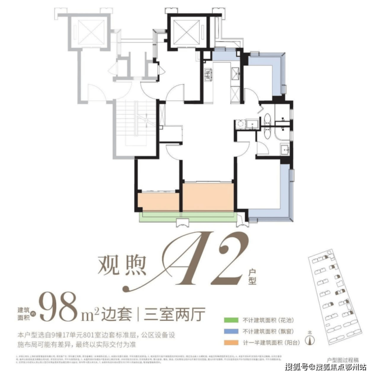 约98㎡3房:类一梯一户、全屋飘窗为标配,双阳台+花池是核心亮点(市面双阳台户型起步多为约110㎡),整体附赠约23㎡,是罕见的高实得率精致户型。