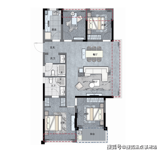 该户型 奢适四房设计,拥南向阳光双卧、北向次卧和书房, 一家三代同室而居,也能从容生活,尽享天伦之乐