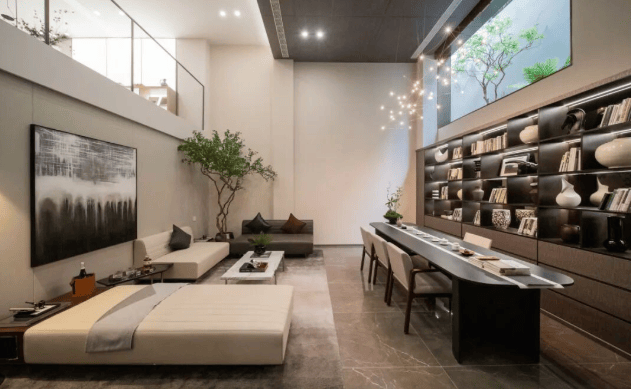 看一眼外立面,白色石材、香槟色的木纹铝板、大面积玻璃的拼接组合,怎么看都不像一个门槛只有400万+的低密叠墅。玉琮水景、山石跌水等等融入景观的大量良渚文明元素,弥漫着专属于杭州的千年气韵。满眼的“越级感”再配上只有1.2的超低容积率,最终才呈现出一座全低密真双叠大盘的样子。