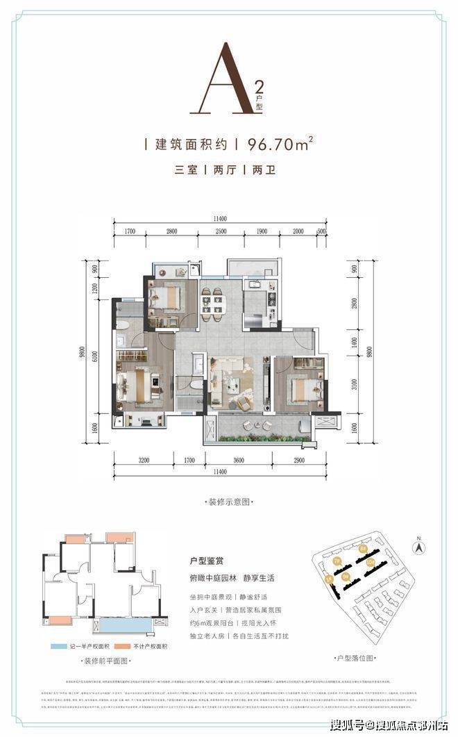 A2户型 建面约96.70㎡ 三室两厅两卫