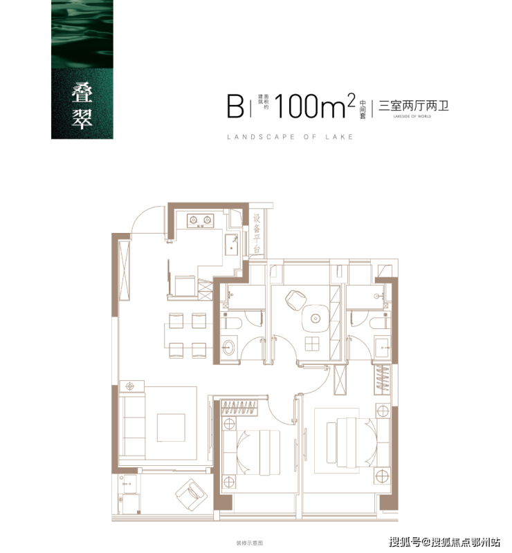 建面约100㎡B户型(中间套)▼