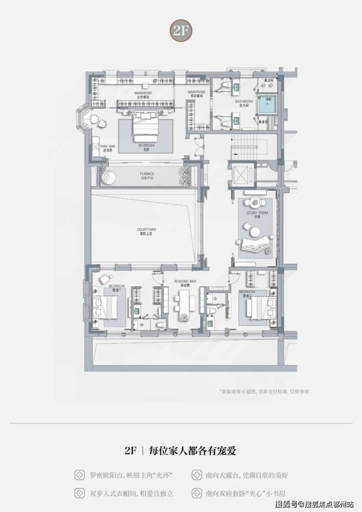 • 一层长辈套房设计,南向独立小庭院,莳花弄草,晨练太极自在四季