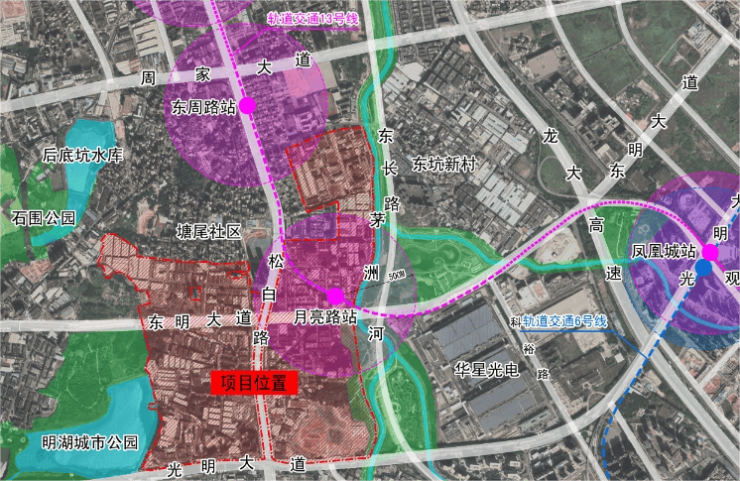 片区更新单元有轨道快线13号线(在建)穿过,是13号线(在建)月亮路站的TOD大城。从月亮路站出发,1站即达凤凰城站,在此处换乘6号线,可便捷通达福田中心;3站即到轨道枢纽光明城站,搭乘高铁,可快速直达深圳北、福田。