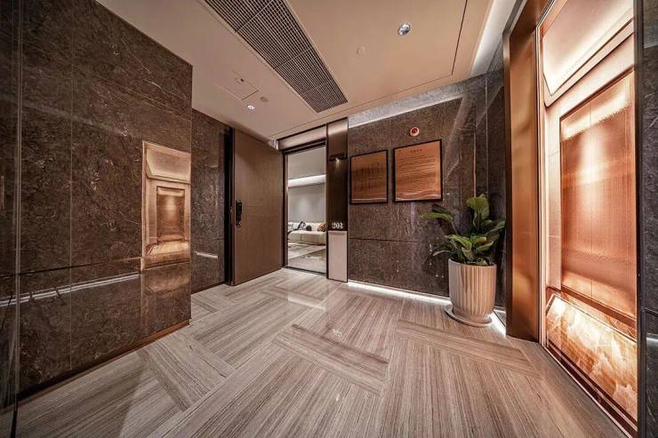更值得一提的是,项目打造的 电梯轿厢都比一般的电梯高空间感打造上相当出彩 ,搭配 无主灯悬浮吊顶与金属墙面 设计,海派归家仪式感拉满!
