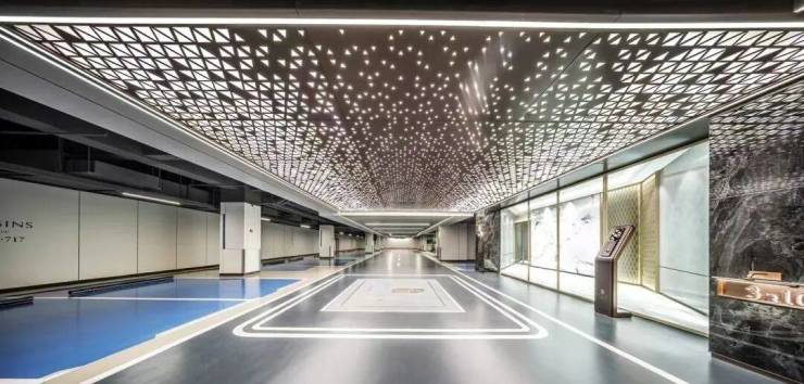 除此之外,项目还有 地下车库空间实景呈现 ,未来业主 地库入户大堂、电梯厅 等都高质量打造呈现,品质感十足! 星空顶 设计感相当惊艳, 地下入户大堂及电梯厅的木纹拼花地板 足见其设计团队的超高审美!