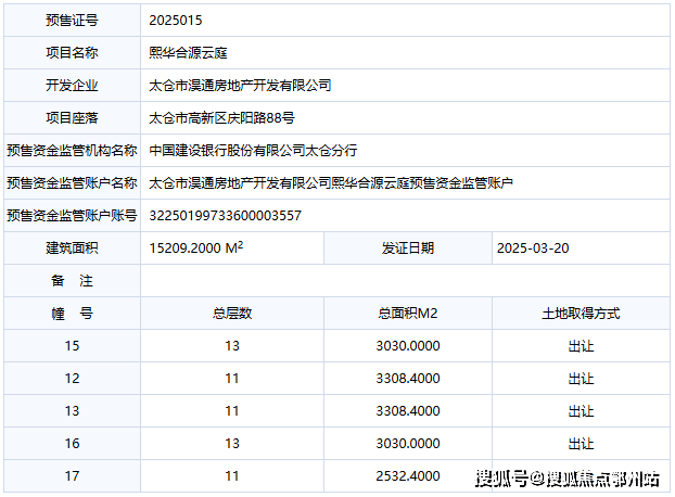 位于太仓 高新区板块的 熙华合源云庭取得预售许可证。此次预售楼栋为 12、13、15、16、17、21、22、23、25号楼,共计新增建筑面积41743.12㎡,新增房源 314套